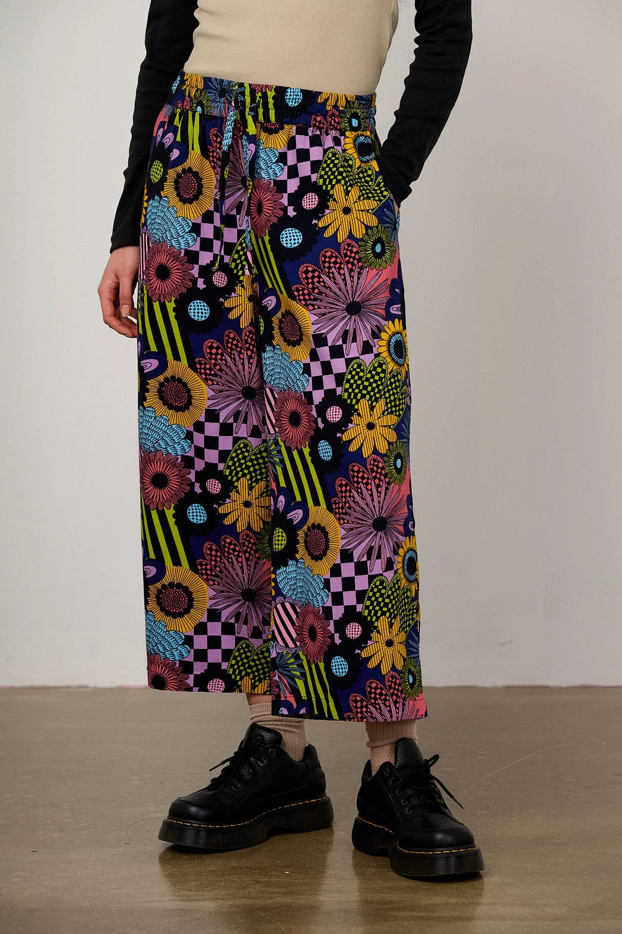 Chuck is our cropped relaxed trouser with elasticated waist and drawstring ties. Available here in Dreams Over Reality.
