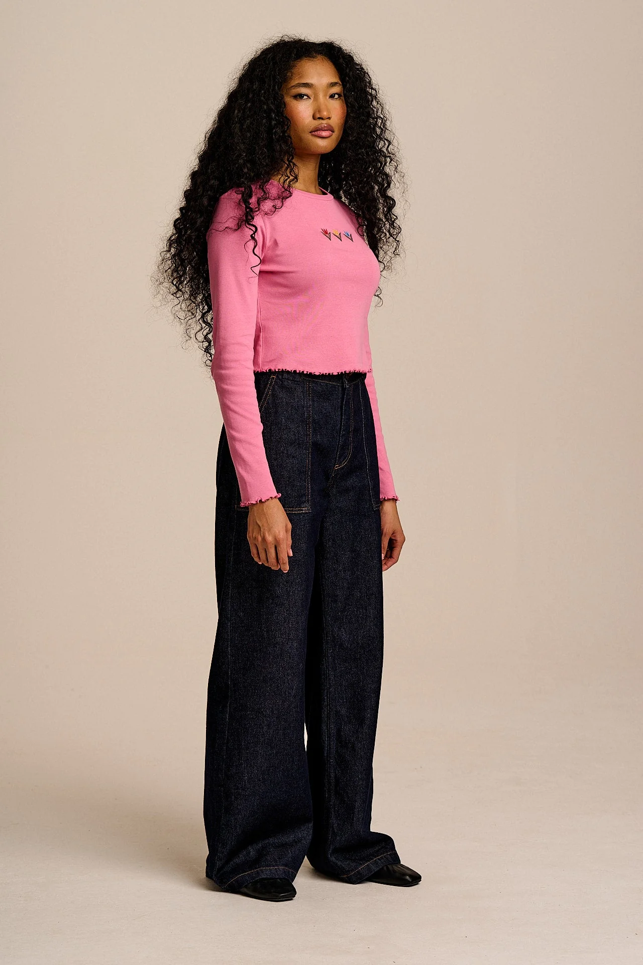 Hansel is our fitted long sleeve top in a cropped length with lettuce edge detail. Available in Pink Tulip Embroidery