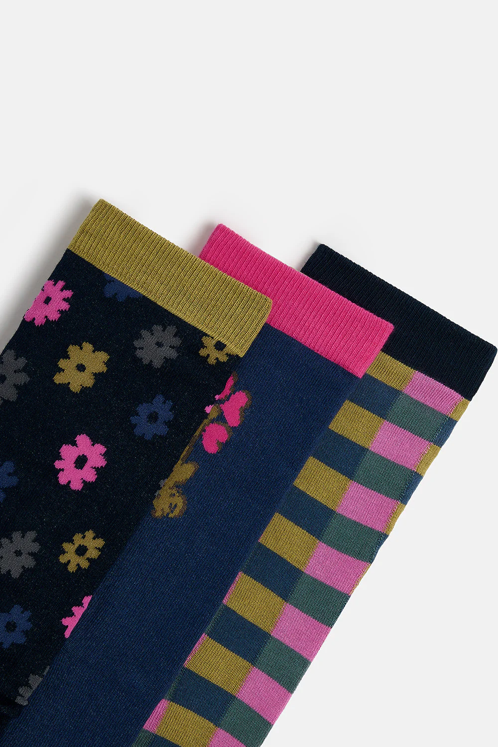 A box of 3 classic JoJo socks, perfect for gifting. JoJo are our ankle socks knitted in our Lucy & Yak prints made from an organic cotton mix fabric.