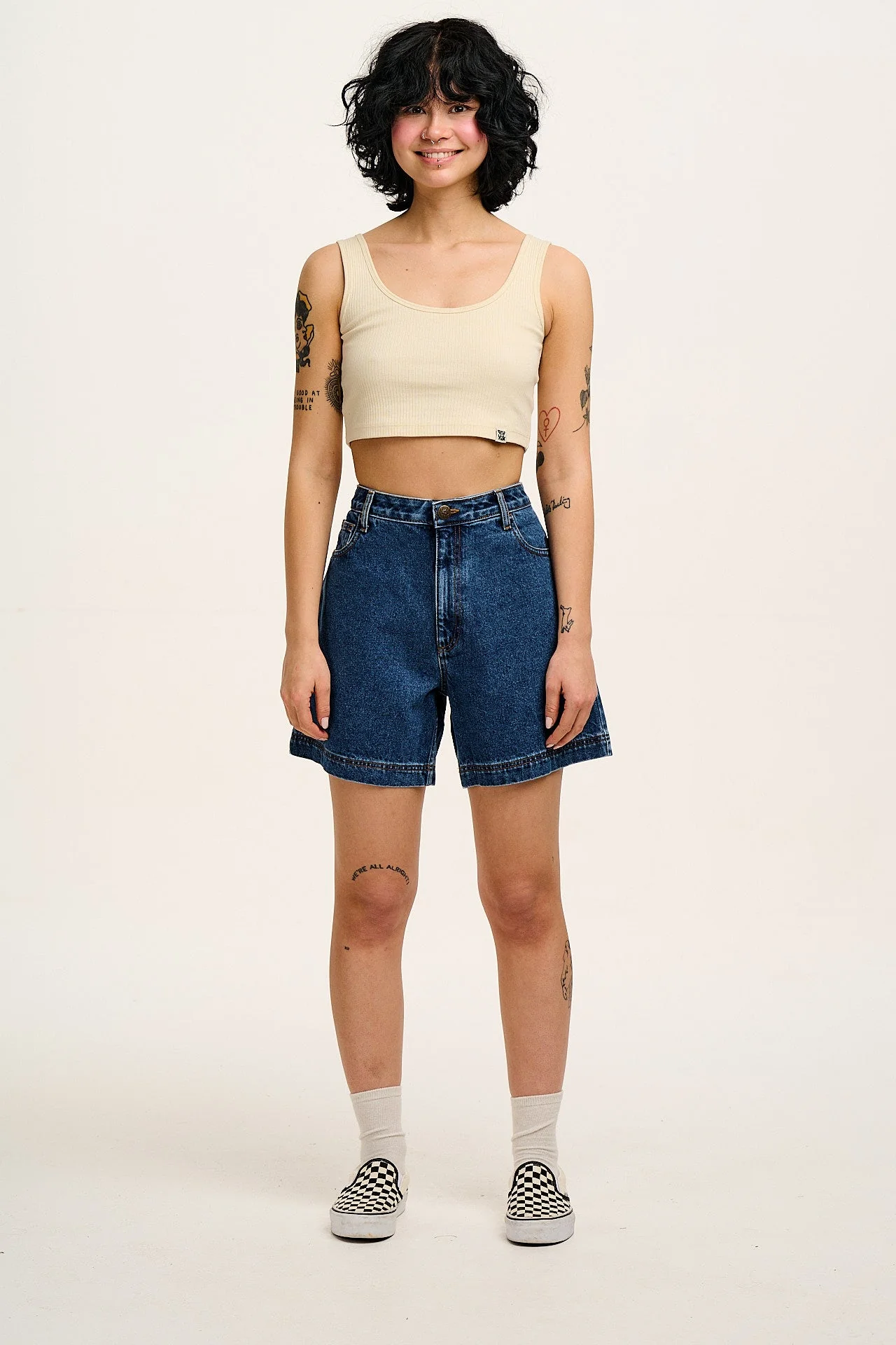Lexi is our high waist denim shorts with a mid-thigh length.