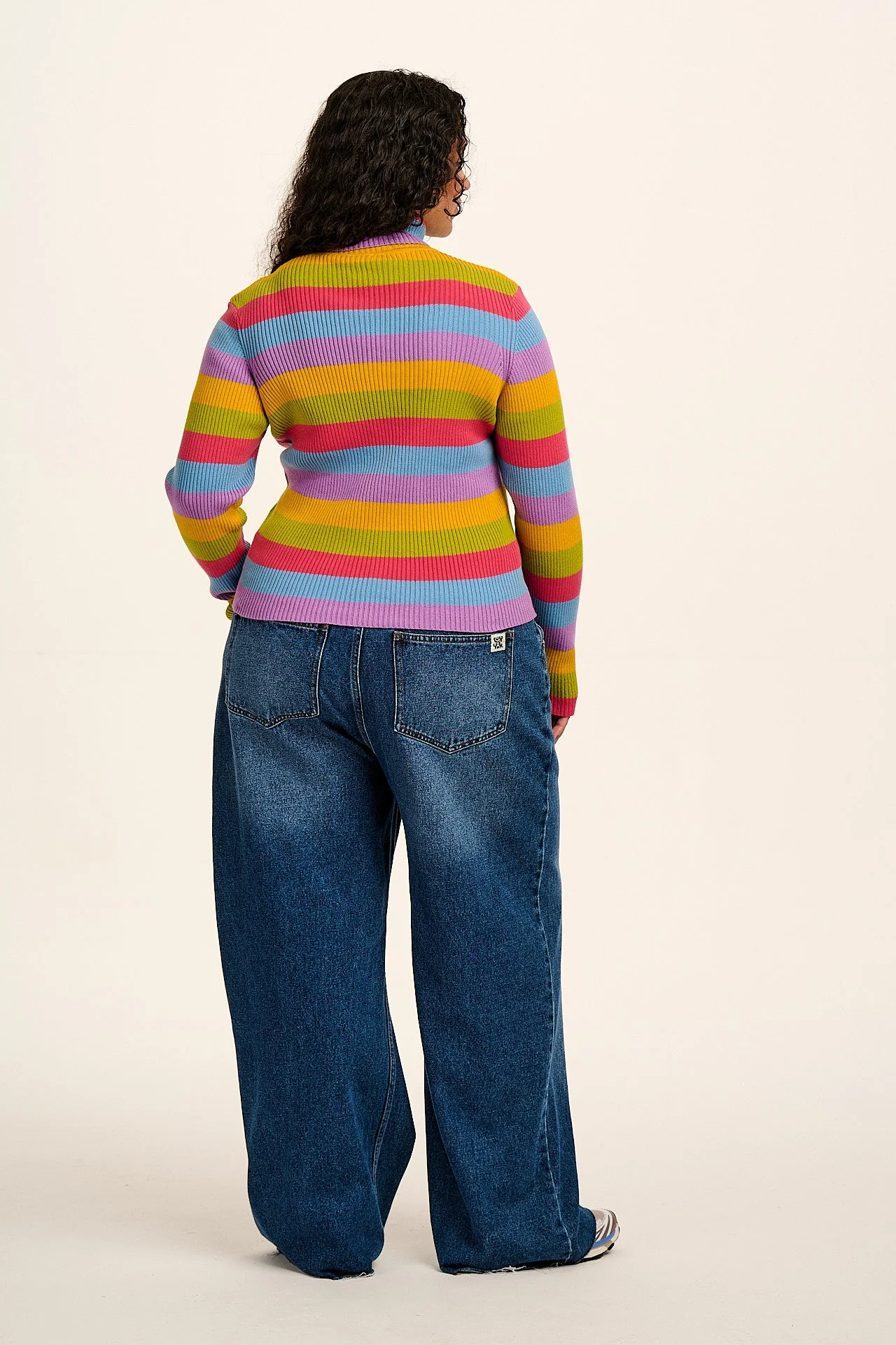 Eva, our roll-neck long-Sleeve rib knit top. A staple for winter layering, looks perfect under those Dungas. Available here in Rainbow Stripe.